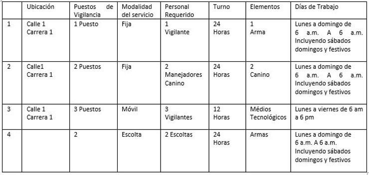 SE RECOMIENDA: Especificar claramente los elementos requeridos tales como: armas, equipos de comunicaciones, caninos, medios tecnológicos etc., así como el personal, como por ejemplo si es femenino o masculino. los vigilantes pueden usar pitos, linternas, bastones de mando, esposas, armas y gases.