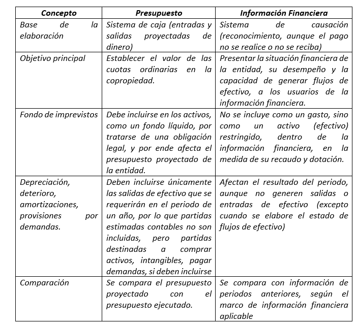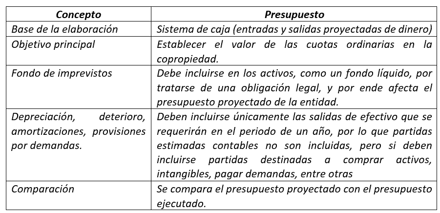 Con relación a la elaboración del presupuesto en los edificios o conjuntos sometidos al régimen de Propiedad Horizontal, se pronunció el Consejo Técnico de la Contaduría Pública (CTCP) mediante concepto número 0713 del 30 de noviembre de 2021, mencionando parámetros que deben ser considerados para su elaboración y señalando algunas diferencias entre presupuesto e información financiera, en los siguientes términos:
